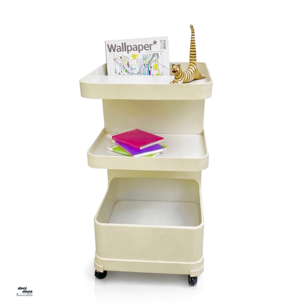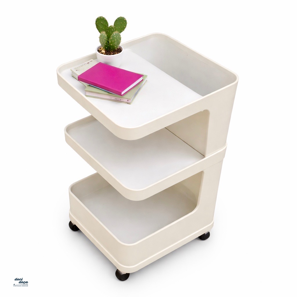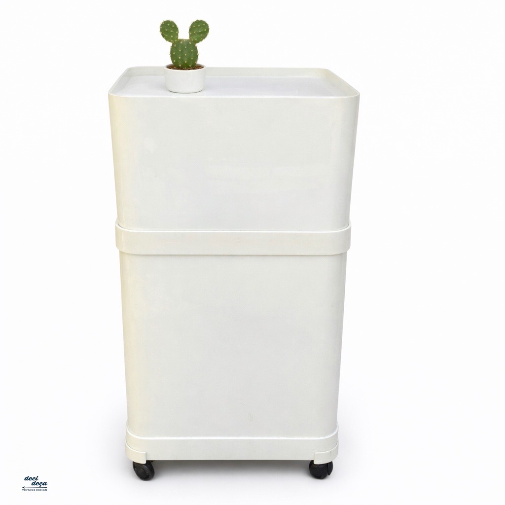 Caisson en plastique blanc monté sur roulettes. Table de chevet, desserte bar à trois étages. Deux tablettes, une niche verticale et un caisson ouvert en partie basse. Meuble de rangement nomade multi fonction. Bon état d’usage, plastique pas décoloré et brillant.